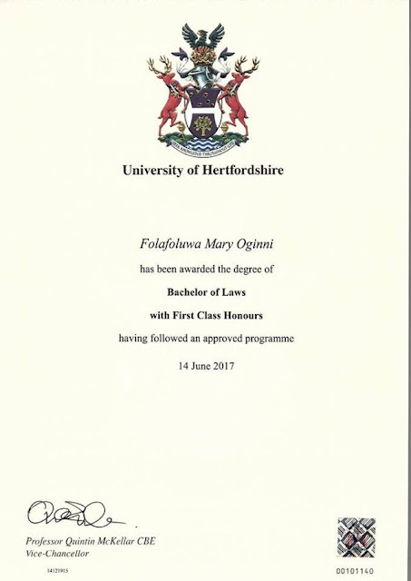 She went to the UK to continue at the University of Heterfordshire where she became the first Nigerian Valedictorian after finishing with a perfect CGPA of 5.0 scoring 360 out of 360.