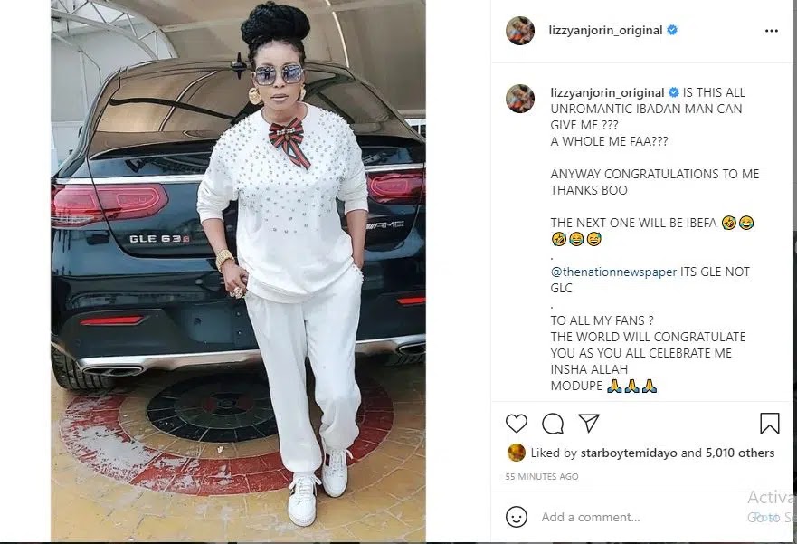 “Mr Lawal for President (swipe right for more pictures) I mean this car is nothing less than 80 million, o yes, you heard me well ( this one is not our mate this is year 2020)… So Mr Lawal called me the day before yesterday and said it is going to be a year Anniversary and he wants to give wifey @lizzyanjorin_original a small car, I was like is she back to.