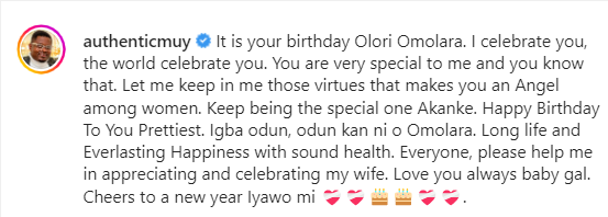 Popular actor Muyiwa Ademola has sent a sweet birthday greeting to his wife, Omolara Ademola, as she turns another year older.