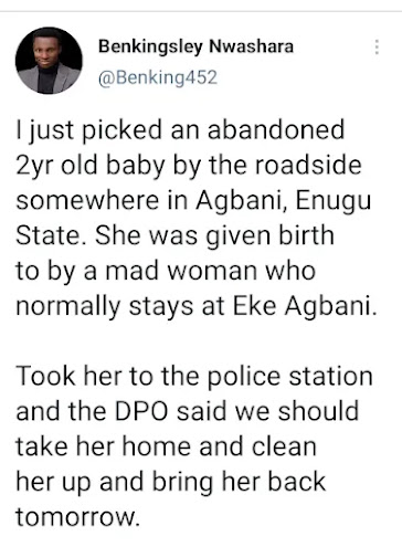 "I just picked an abandoned 2yr old baby by the roadside somewhere in Agbani, Enugu State. She wa given birth to by a mad woman who normally stays at Eke Agbani. Took her to the police station and the DPO said we should take her home and clean her up and bring her back tomorrow," he narated.