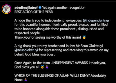 Nigerian actor Lateef Adedimeji was recently honored with the "Best Actor of the Year" award by the Independent Newspaper at an awards ceremony. The actor shared the exciting news with his fans and followers on Instagram, expressing his appreciation for the recognition. This is a significant achievement for Lateef and acknowledges his talent and hard work in the entertainment industry. His fans and well-wishers congratulated him on his achievement and expressed their support for his future endeavors.