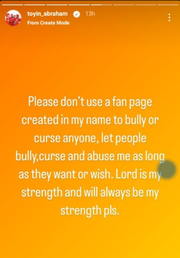 Taking to her Instagram story, Toyin Abraham urged fans who have created fan pages in her name to refrain from bullying or cursing others. She emphasized her reliance on the Lord's strength, asserting that she remains unaffected by any negative comments or harassment from trolls.